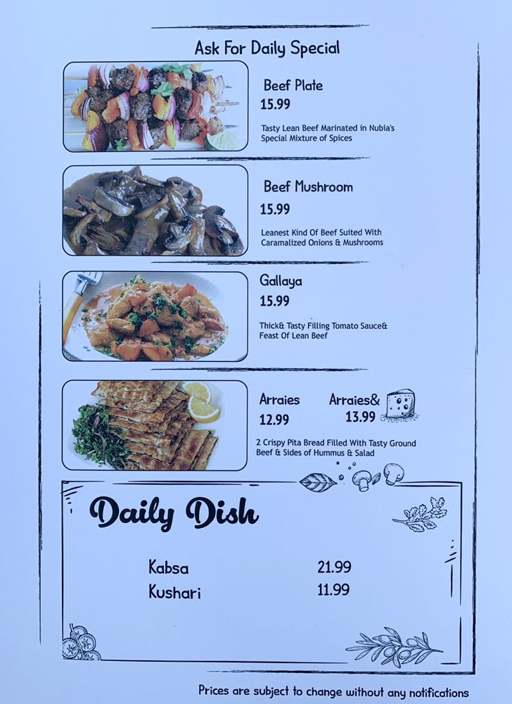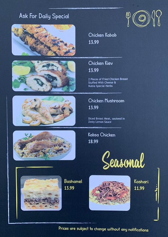 Nubia's signature dish. pieces of fried chicken breast stuffed with cheese and Nubia special herbs.Sizable plate served with rice hummus salad and Pita Bread.Halal